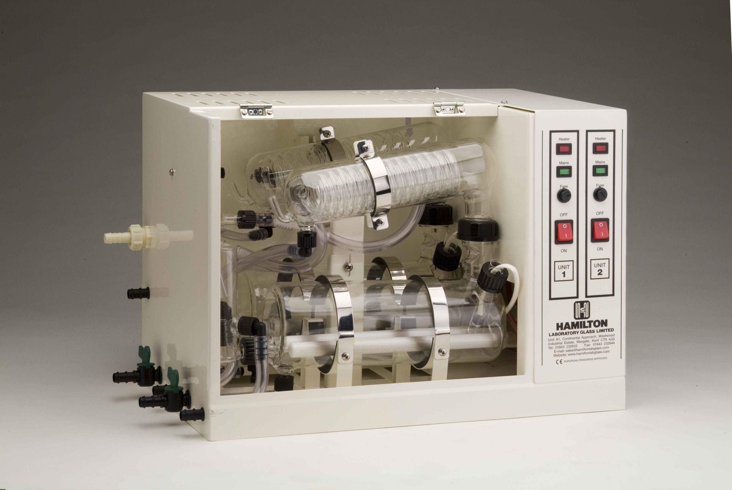 Máy cất nước WSC/4D hai lần dạng tủ, sử dụng thủy tinh borosilicate cao cấp và tích hợp van điều chỉnh lưu lượng, cho ra nước cất siêu tinh khiết không chứa pyrogen – lý tưởng cho các ứng dụng yêu cầu độ tinh khiết cao như dược phẩm, y tế, vi sinh và phân tích hóa học.